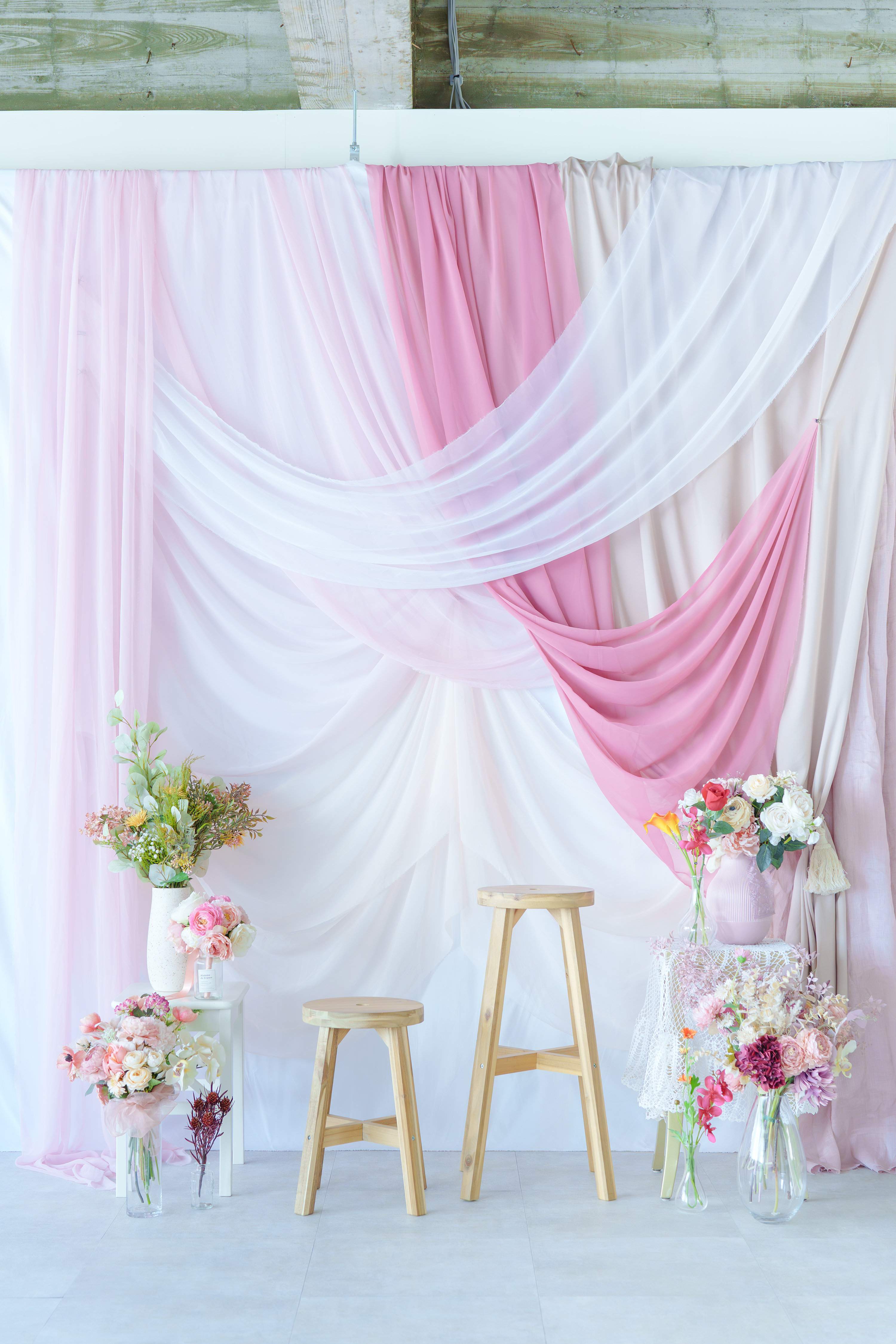 - お花使い放題、ブライダル、前撮り・後撮り、ナチュラル系フォトスタジオ、ブライダル衣装充実、撮影備品・小物充実