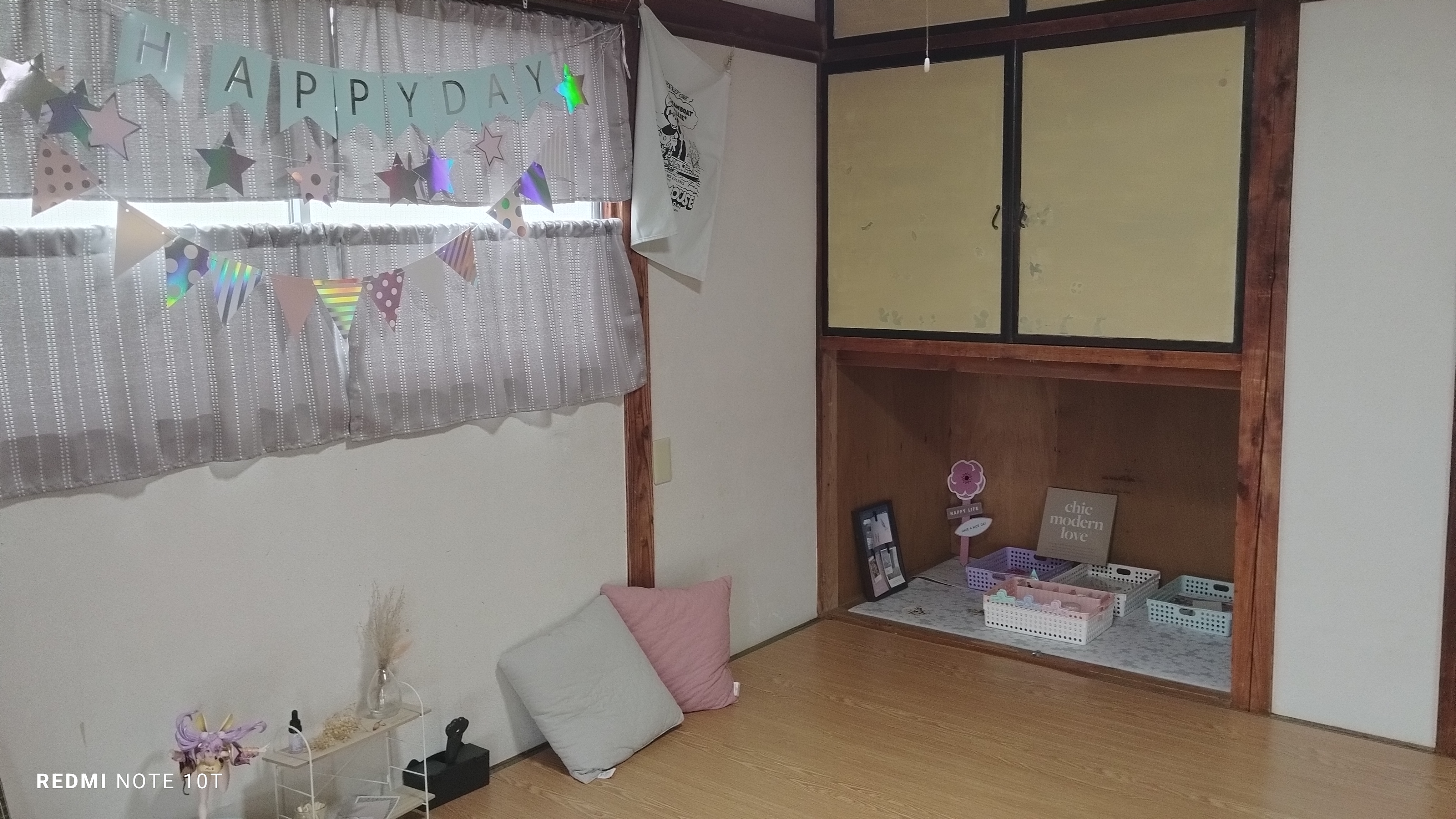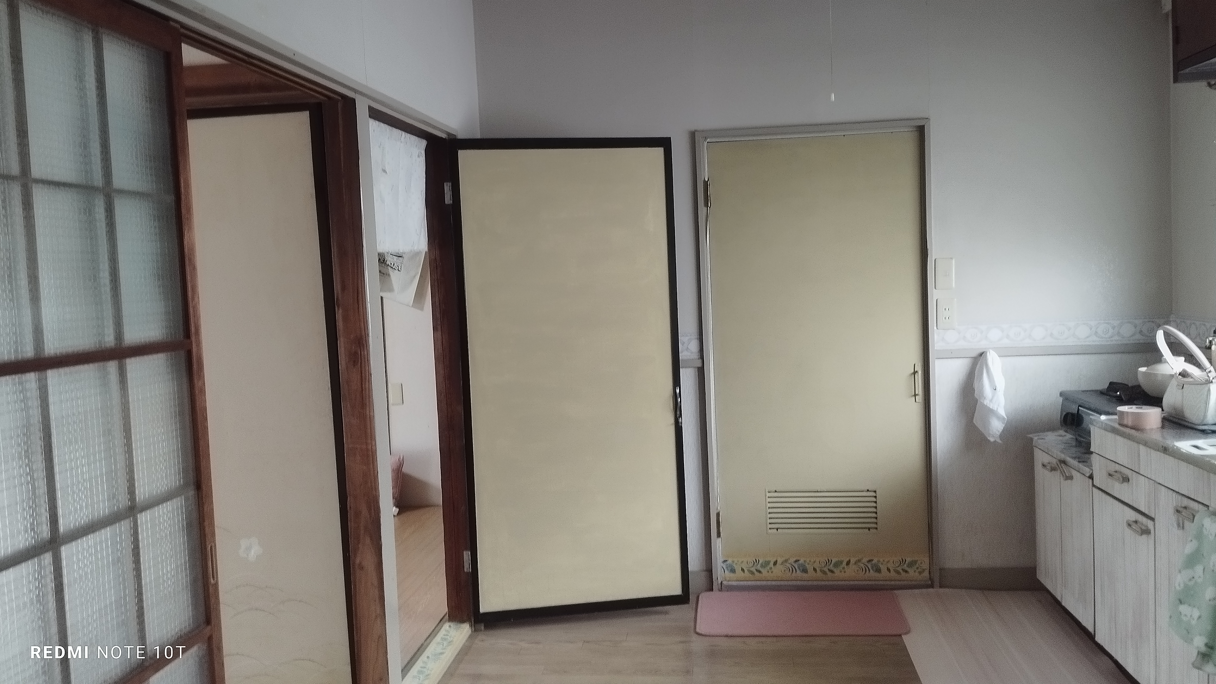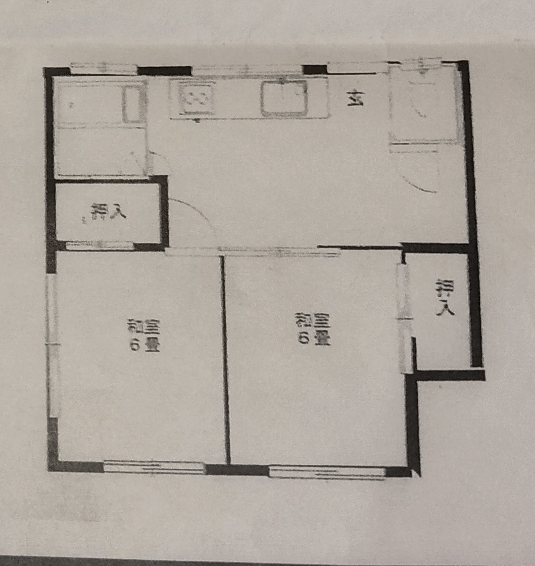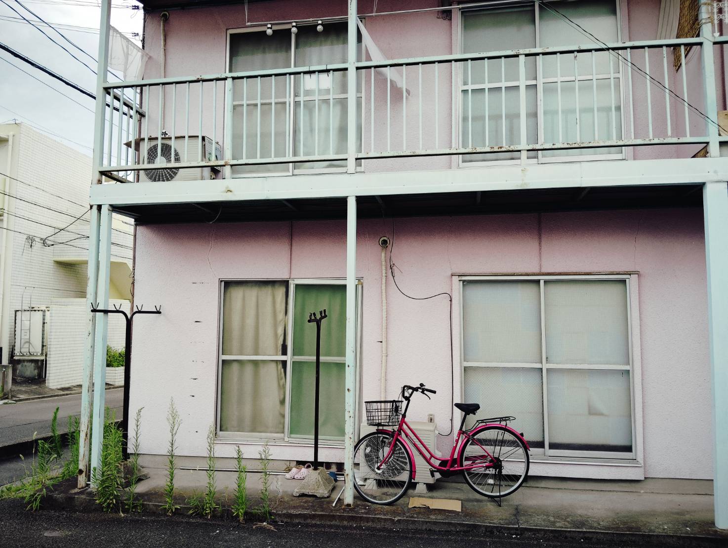 バス停八幡一丁目をおりたら、無人肉店の路を入ります。少し歩くと右側にピンクの古いアパートが見えます、2階の201です