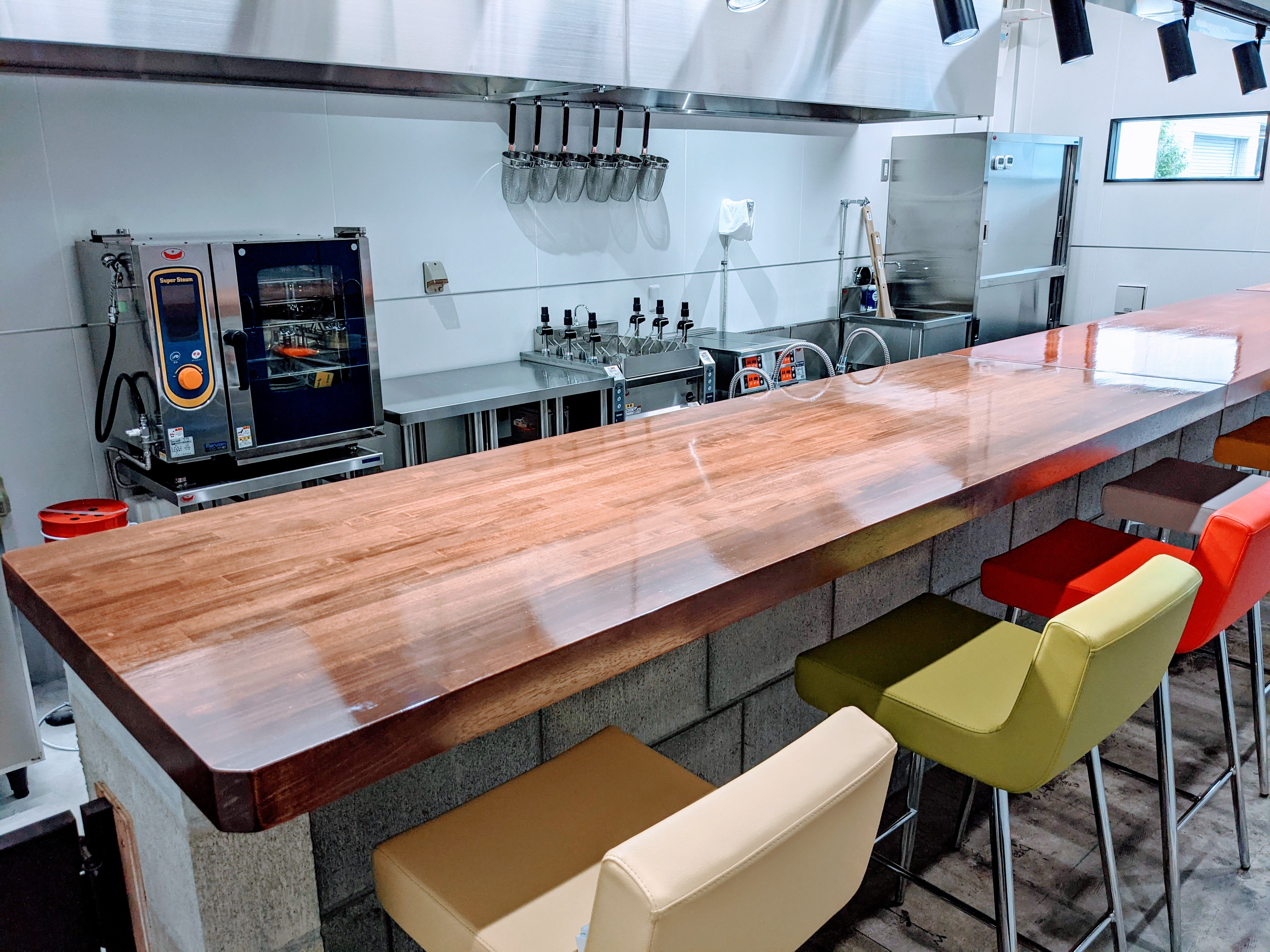 店舗型のレンタルキッチンです。木製の大型カウンターに10脚の椅子をご用意しています。