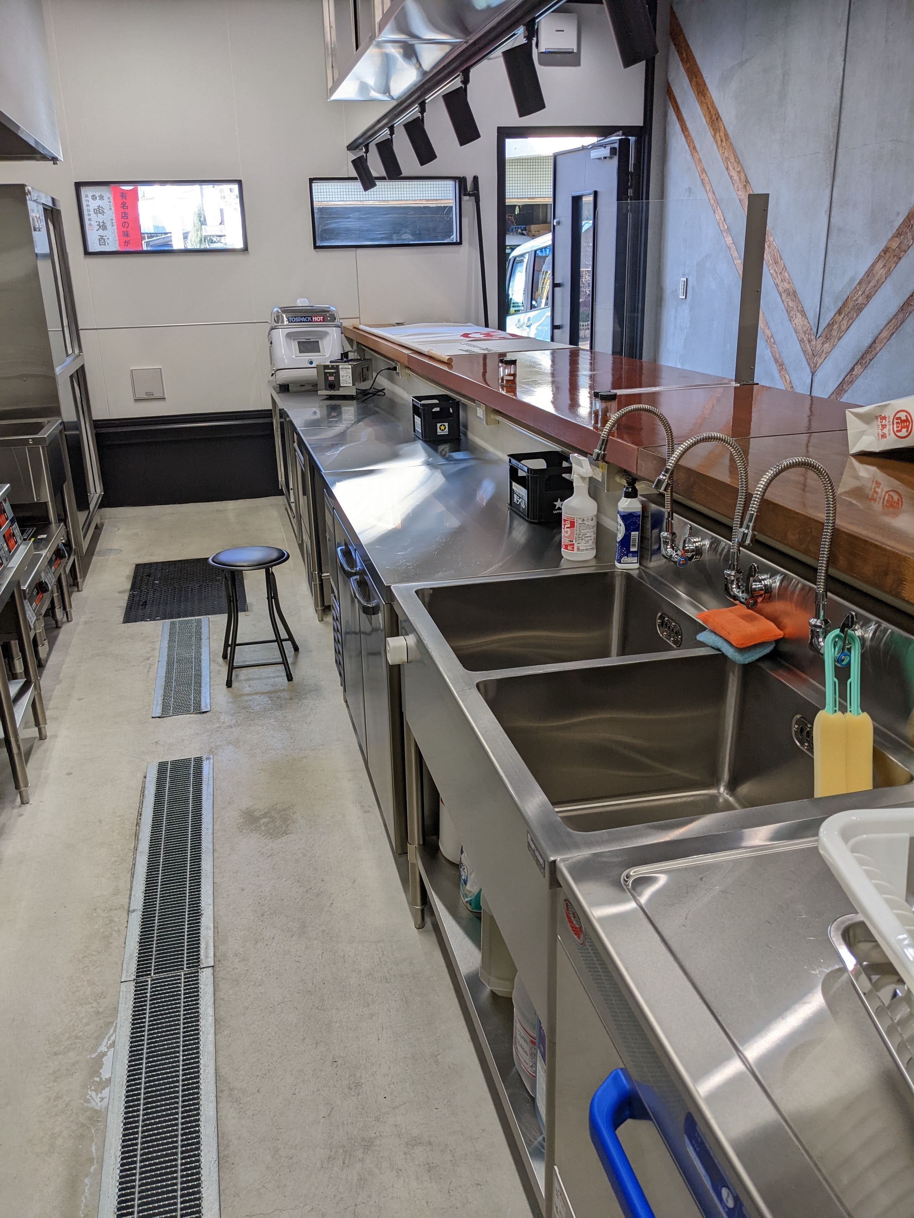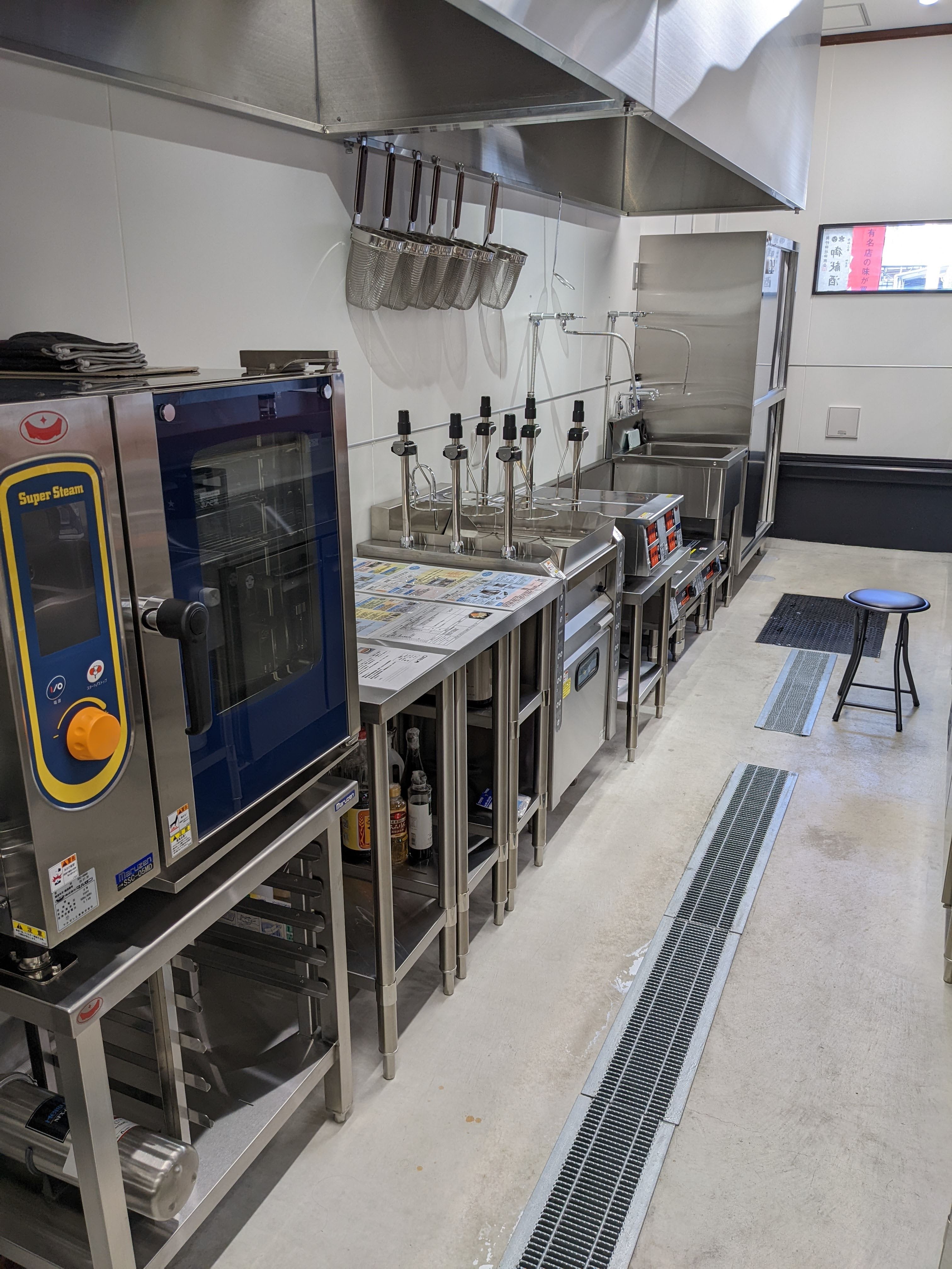 大形のスープレンジが2台、4口の小型コンロ、スチームコンベクション、茹で麺機、食器洗浄機、製氷機などを完備。