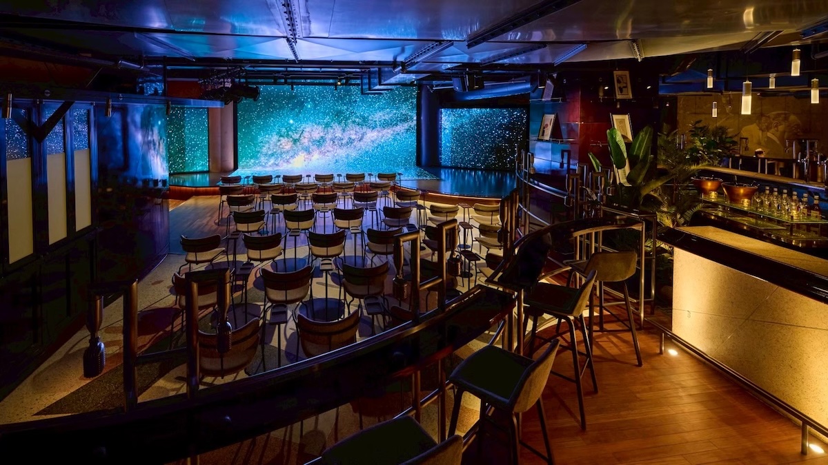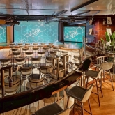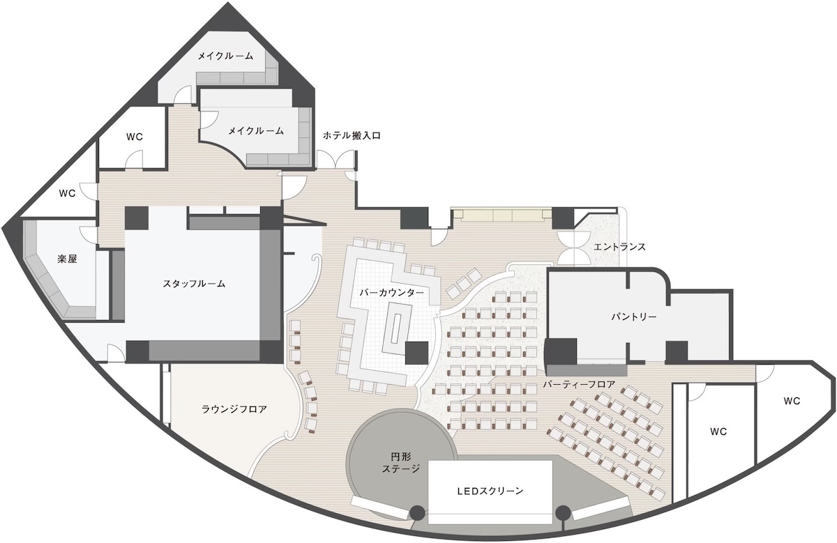 - 大型LEDビジョン、先進の映像・音響設備、バーカウンター、クラシックモダンな内装、イベントスペース、最大100名まで着席可能