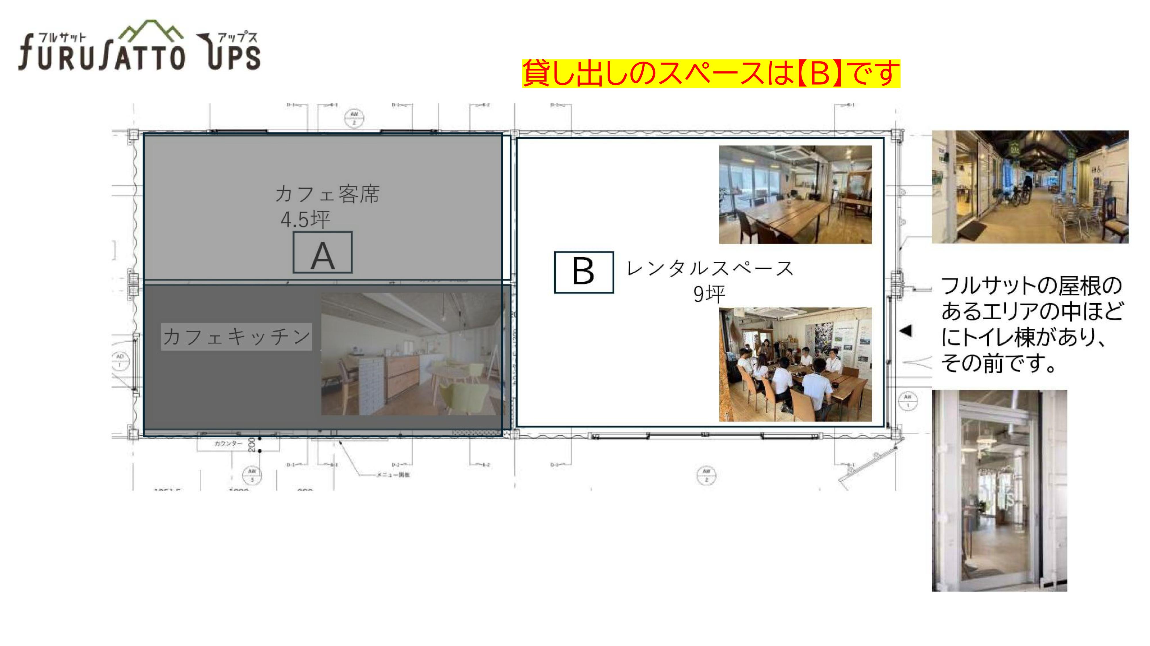 北陸新幹線・えちごトキめき鉄道「上越妙高駅」西口から徒歩1分。コンテナ商店街「フルサット」内にある、30平米のゆったりとしたレンタルスペースです。貸し切り可能で、最大10名様までの少人数グループにも最適。周囲にはビジネスホテルやカフェ、飲食店街が揃い、ビジネスにもプライベートにも便利な立地です。