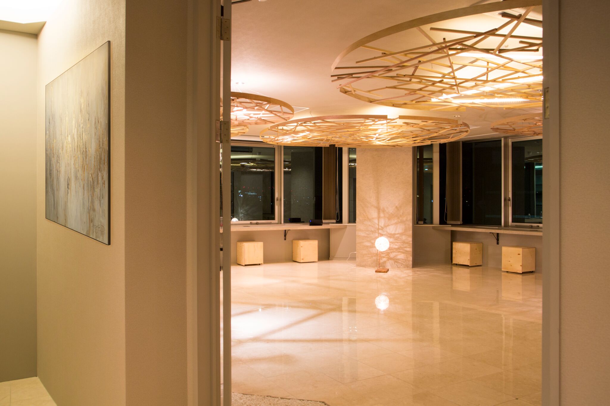 洗練されたデザインの照明が灯る室内は、ヨガやピラティス、パーソナルトレーニングなどのフィットネス利用に最適です。大理石に映り込む光が、あなたのワークアウトをより特別なものへと演出します。