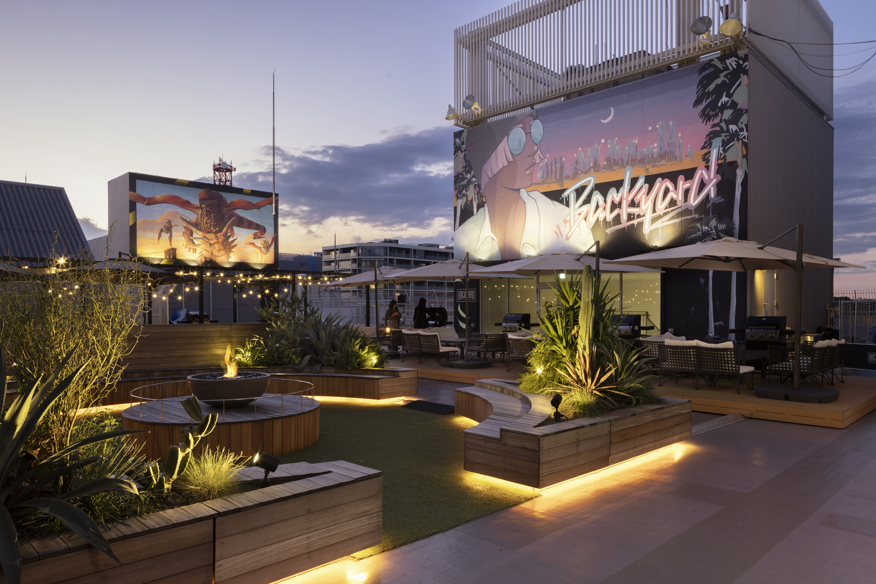屋上には空と街を一望できる特別なロケーションが広がり、壁画アートに囲まれたおしゃれで非日常的な空間を演出します。