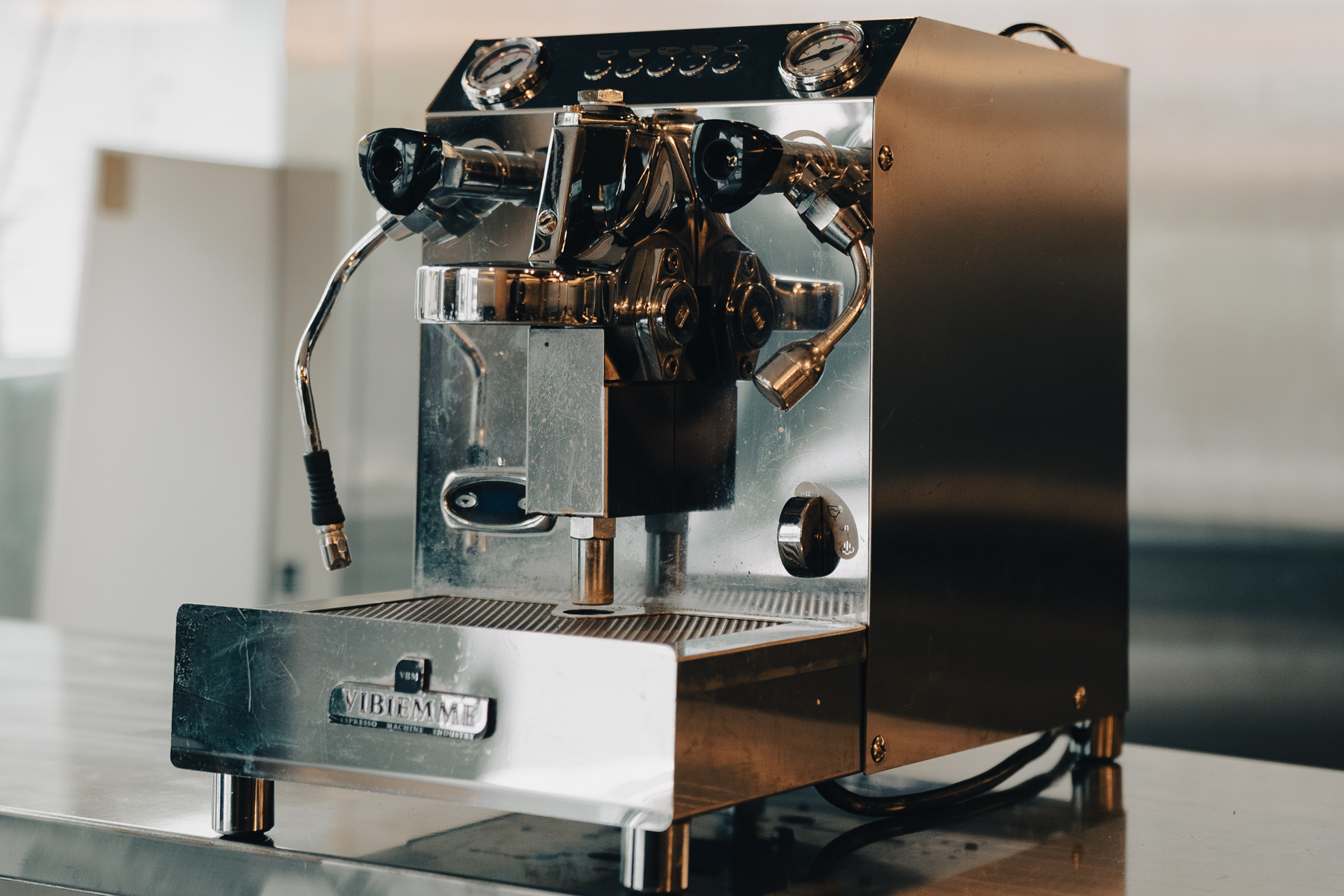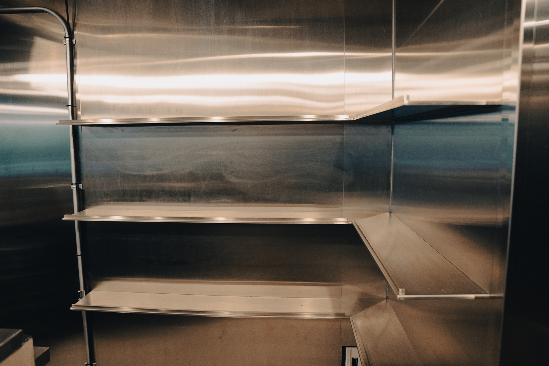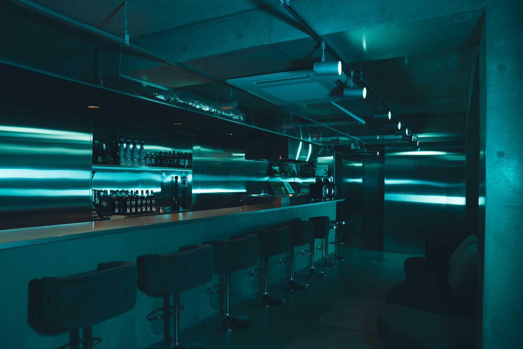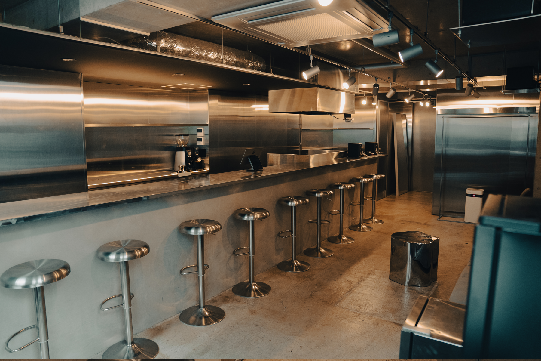 天井から壁一面に広がるステンレスとモルタル床が調和した、洗練された都会的な空間です。フィリップス製の調光システムを完備し、シーンに合わせて照明を自在に演出可能。