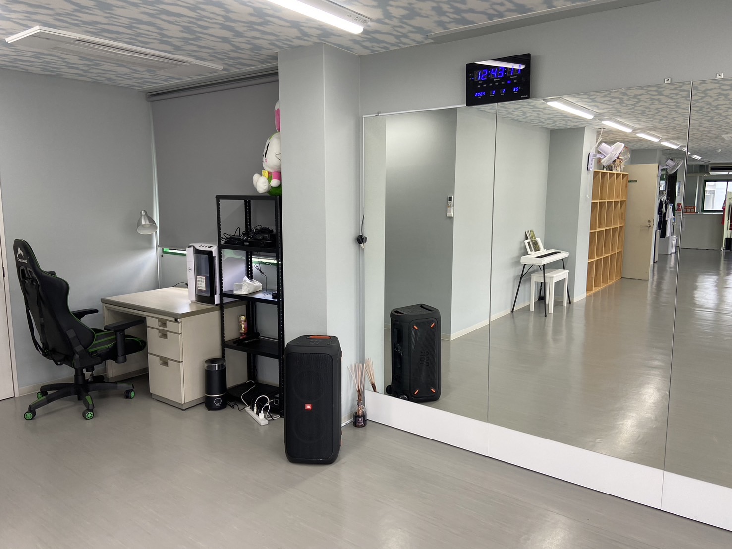 - 大きな鏡でダンスやポージングに最適、エアコン完備、男女別シャワー・トイレ完備、Bluetoothスピーカー完備、高速Wi-Fi、無料駐車場完備