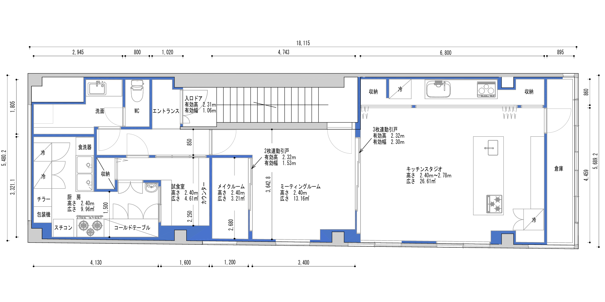業務用キッチンは飲食店営業許可証・惣菜製造許可証・菓子製造許可証を取得しておりますので、シェアキッチン、ゴーストレストラン、テストキッチンやイベントフードなどにもご活用いただけます。オープンキッチンのスタジオです。