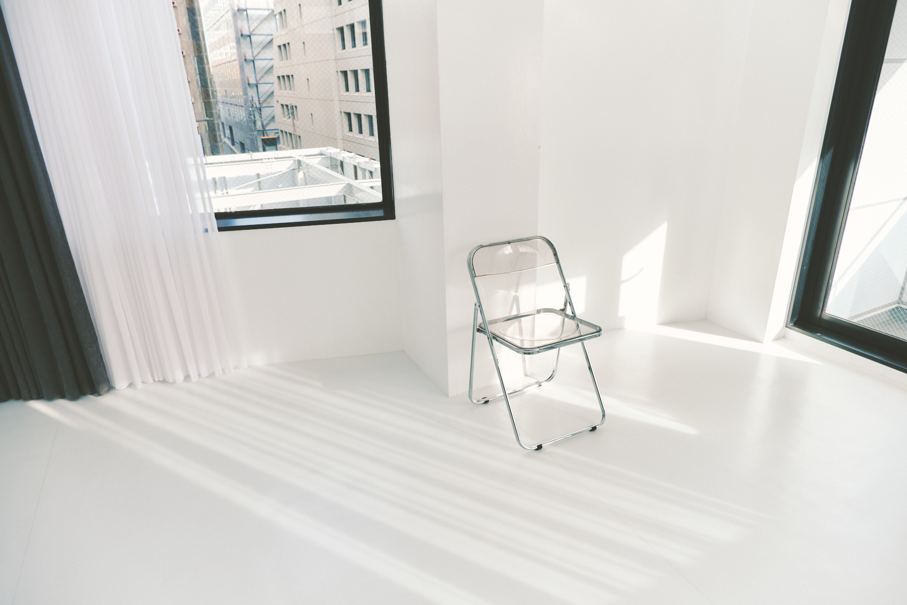 光が午前も午後も入る。エレベーター付きの5階。駅近。メイクルーム&着替えスペースも清潔。遮光可能。床まで白い。付近にパーキングメーター、駐車場多数。空き状況確認&予約&支払いがオンラインで楽々完結。料金は1時間6000円!※3h以上ご利用の場合の料金。1~2hは7500円/h。