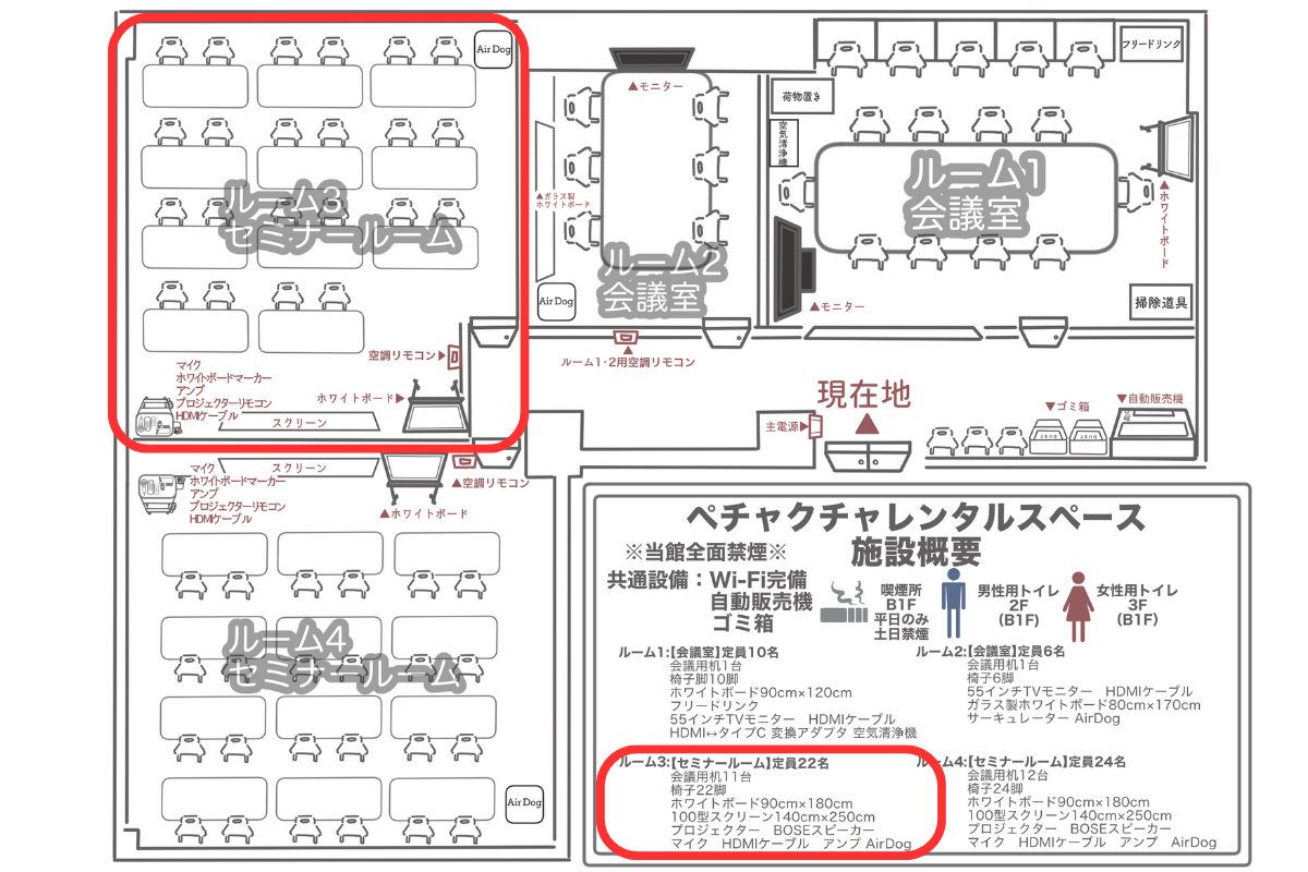 - 会議室、レンタルスペース、セミナールーム、モニター完備、防犯カメラあり、出入り自由