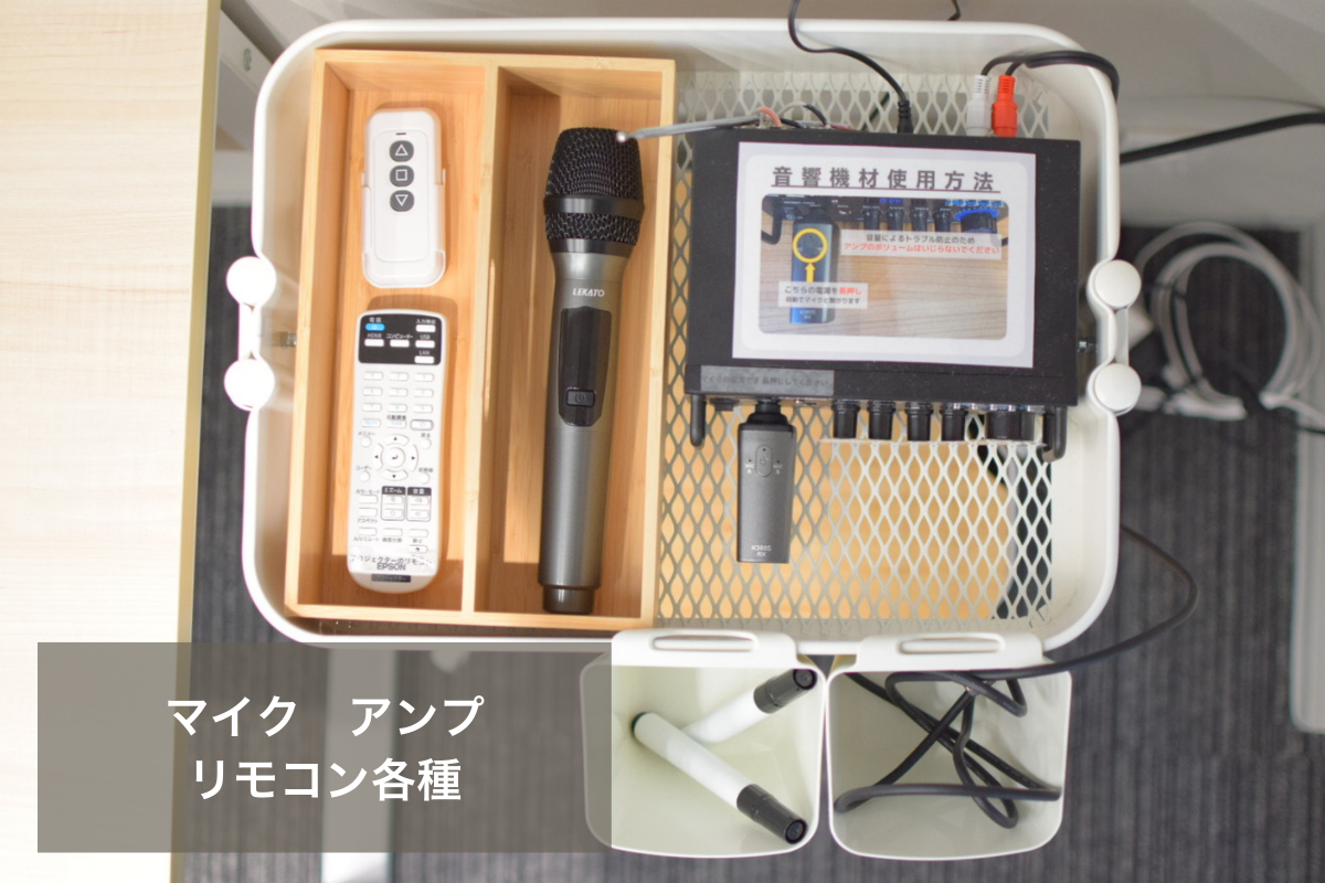 ・プロジェクター、マイク、ホワイトボード等の設備も完備