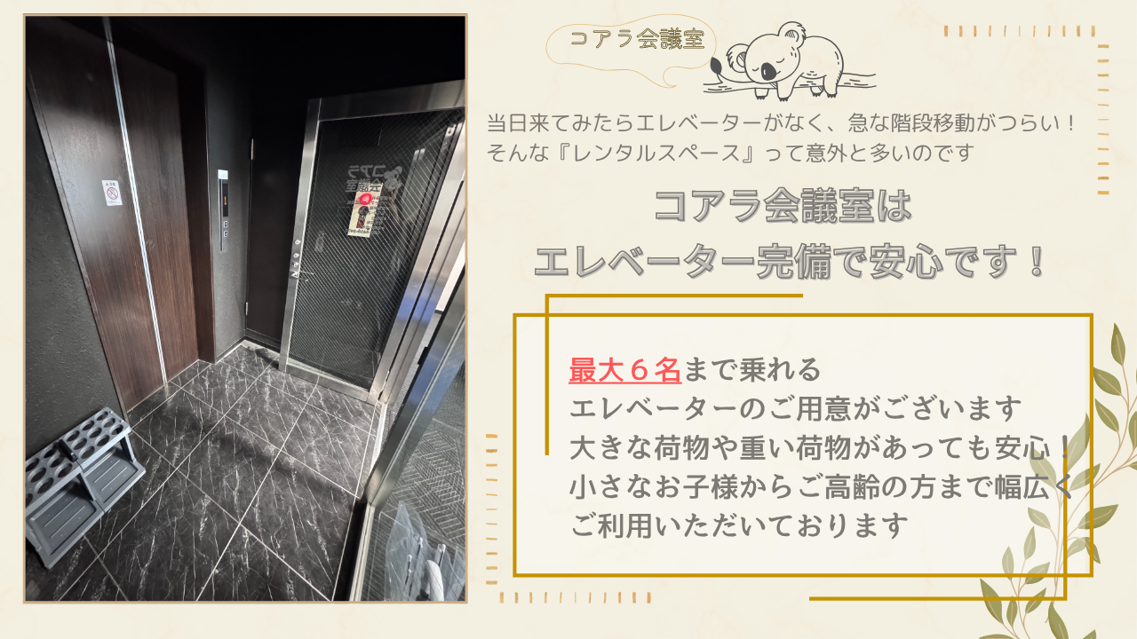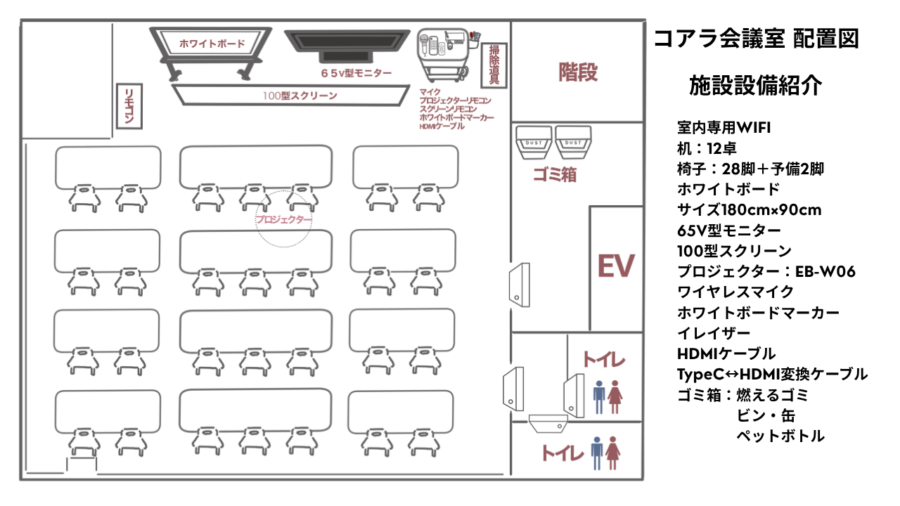 - 会議室、レンタルスペース、セミナールーム、モニター完備、防犯カメラあり、出入り自由