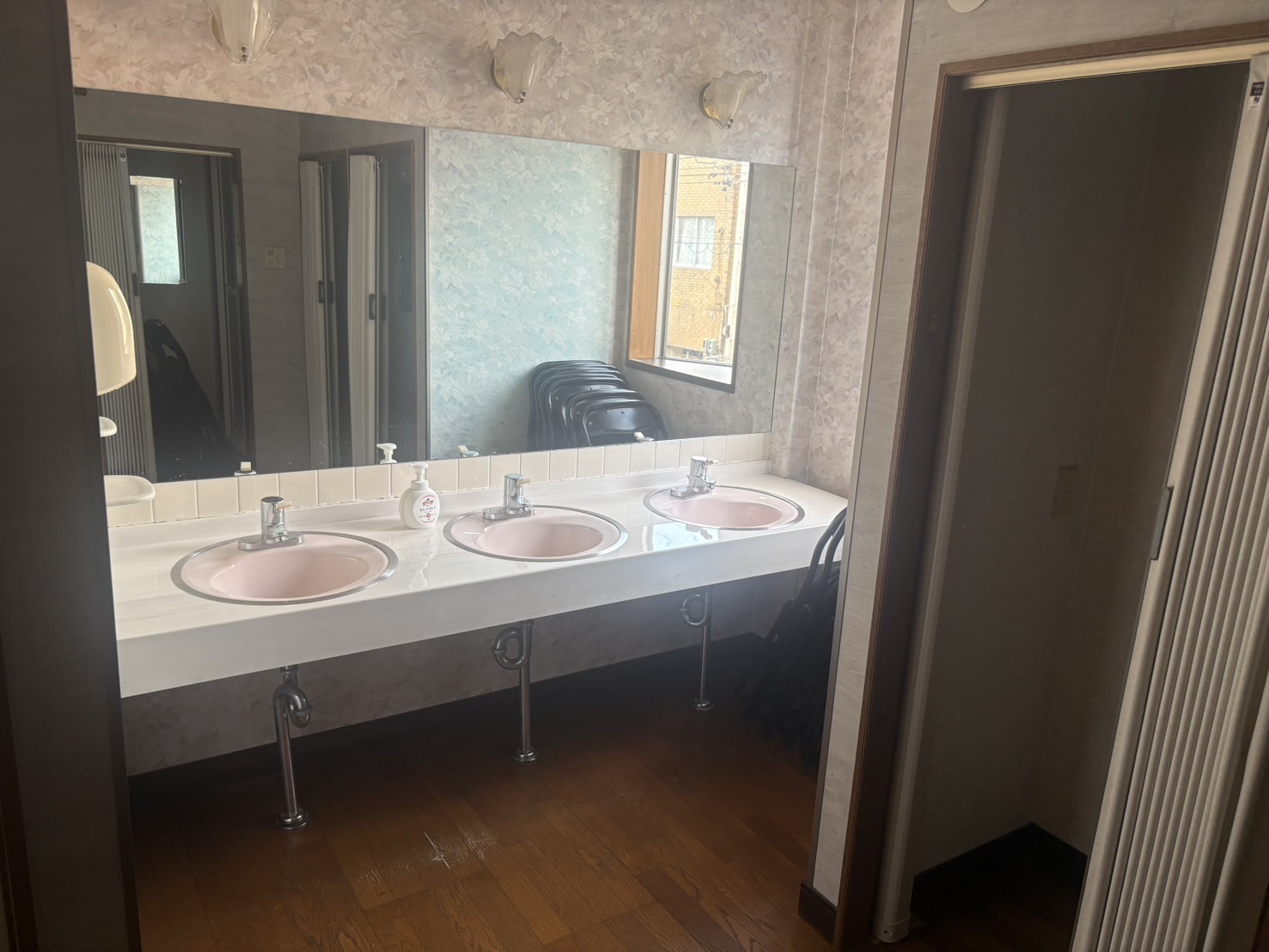 壁2面全体に鏡、もう2面側にはすぐ腰掛け出来る椅子が設置されております。
